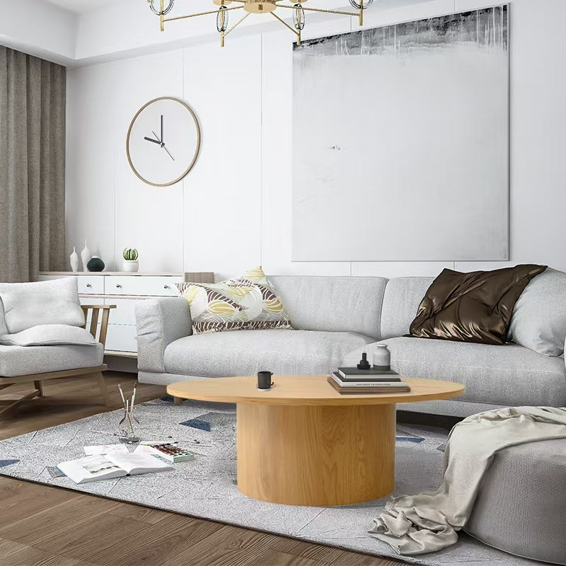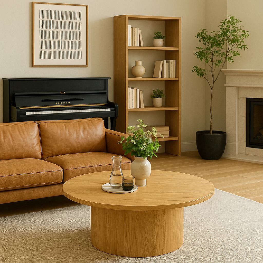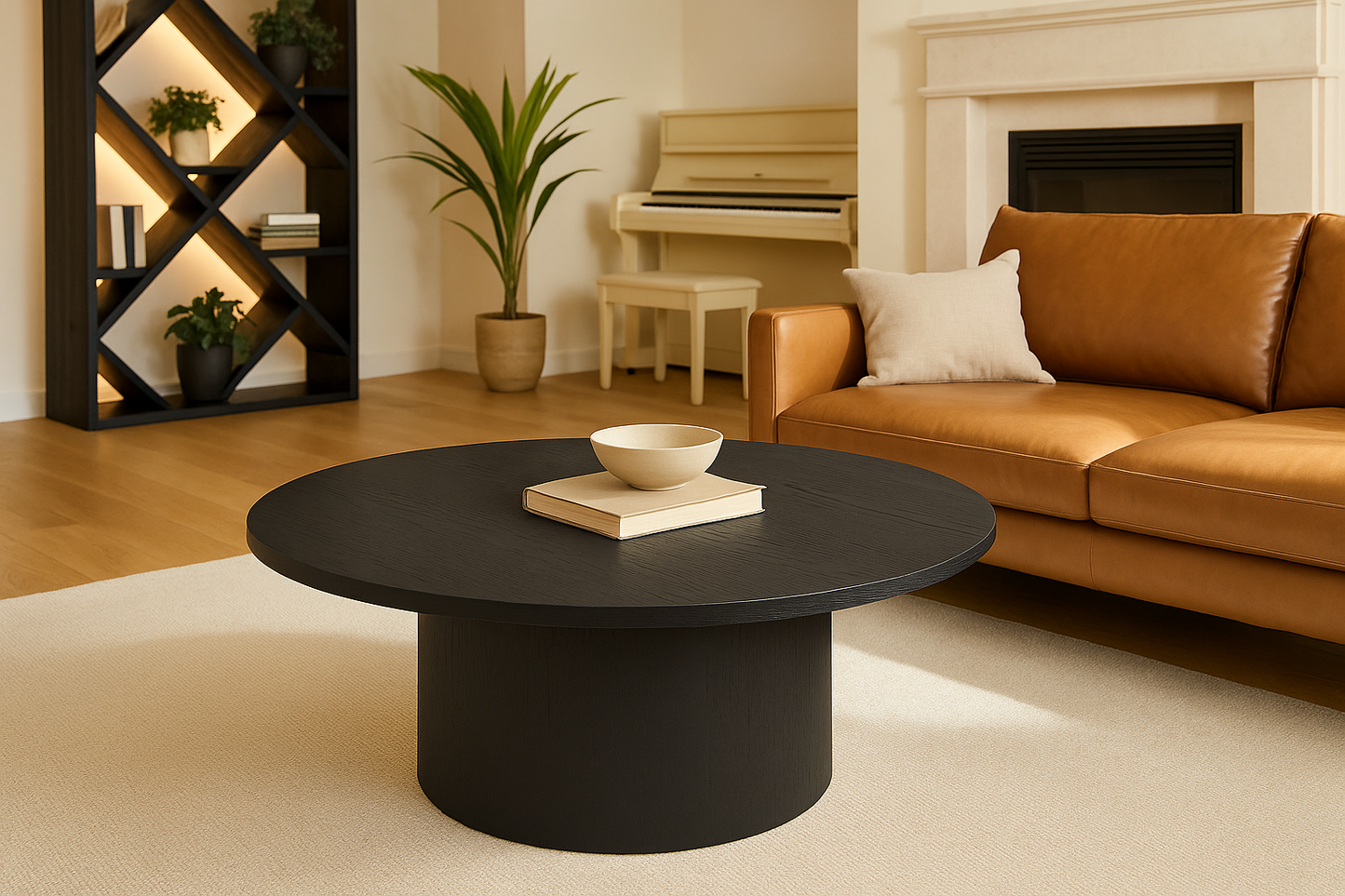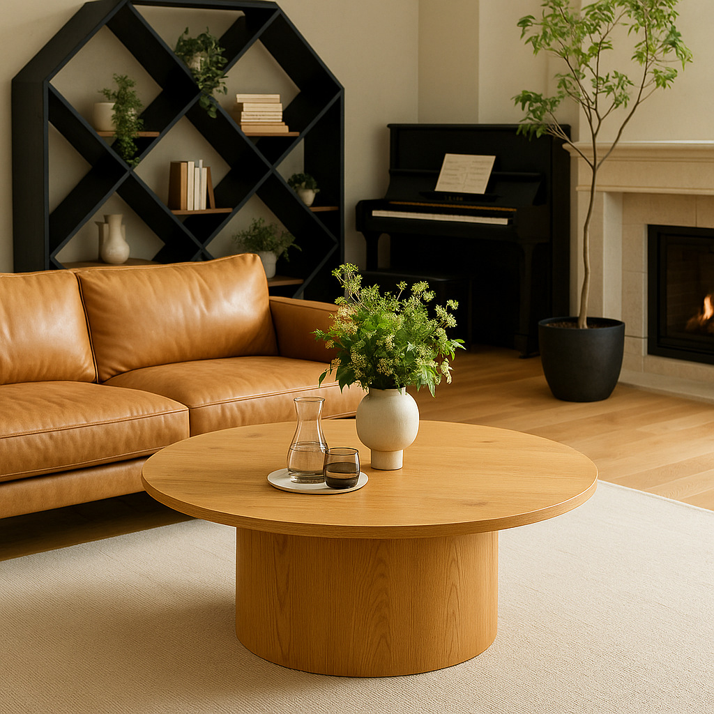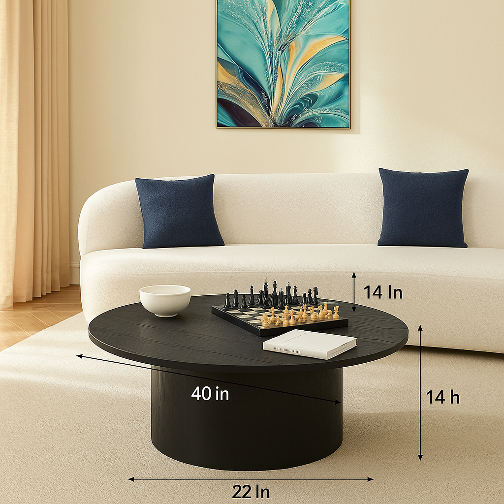 Bring modern sophistication into your home with this 40” round coffee table, crafted for both elegance and practicality. Featuring a striking drum-style pedestal base and a wide, smooth tabletop, this piece is designed to be a functional centerpiece in any contemporary living room. Available in two refined finishes—natural oak and matte black—this table complements both neutral and bold interiors alike.