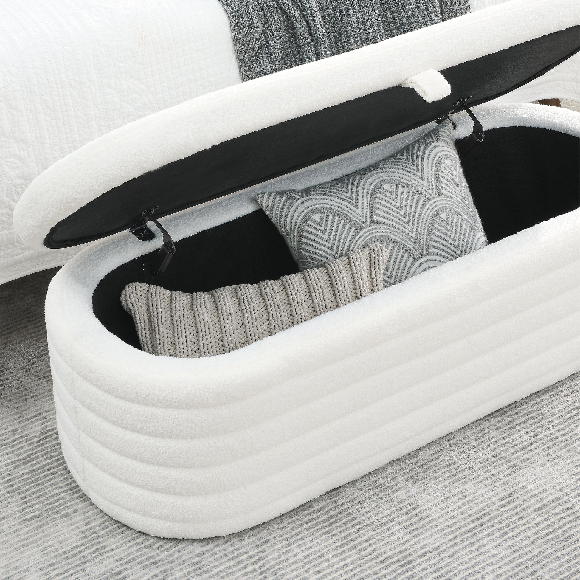 This storage ottoman Bench is an upholstered fabric storage bench designed for various purposes. With a length of 45.5", it offers ample seating and storage space, making it suitable for placement at the end of a bed, in the living room, or in an entryway. The white teddy upholstery adds a charming and cozy touch to the bench's design.