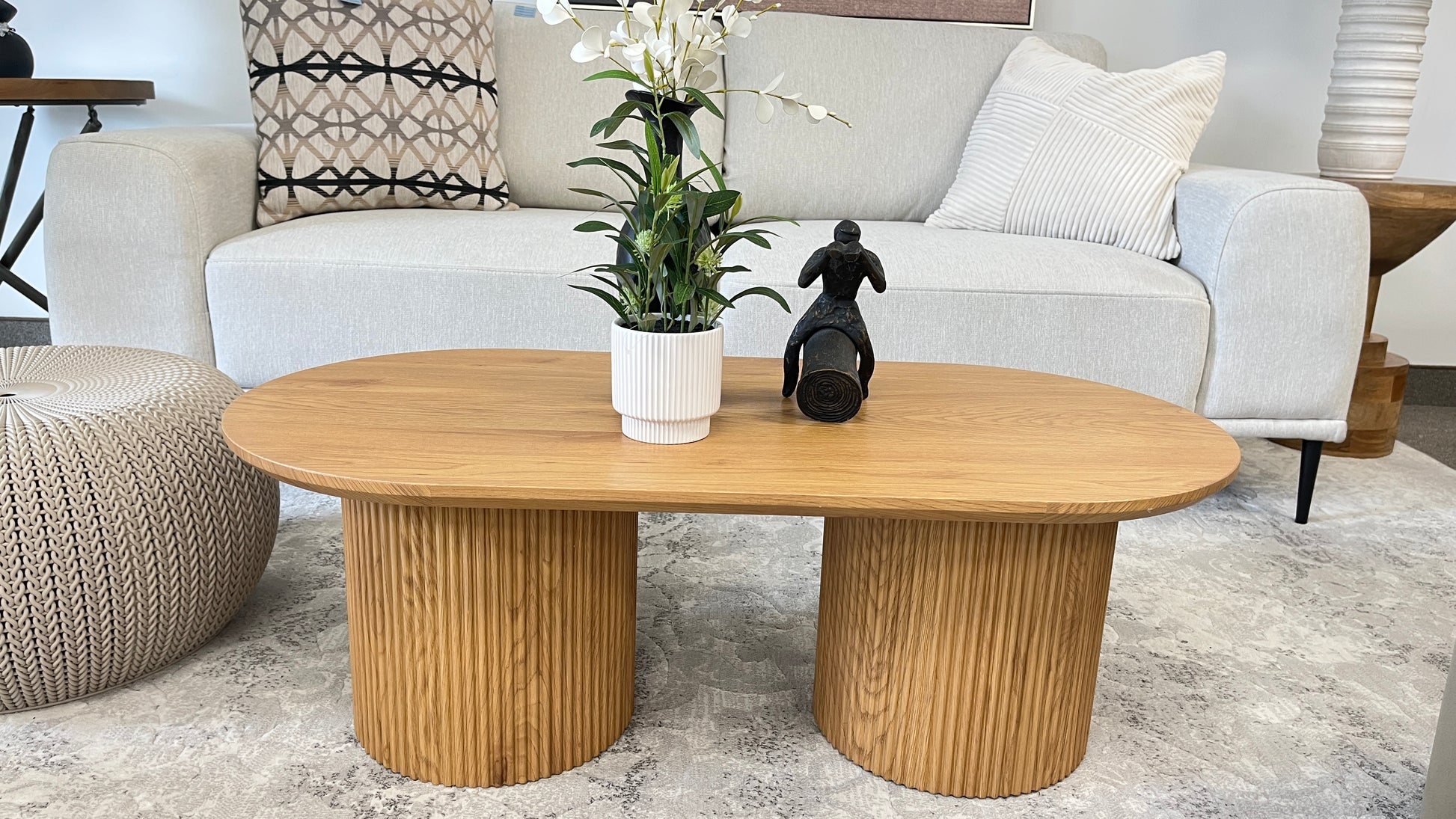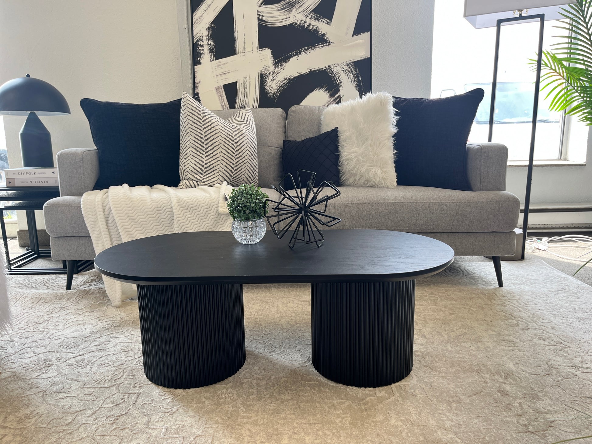 Elevate your living space with this modern oval coffee table, designed with elegance and functionality in mind. Featuring a smooth, elongated oval tabletop and two stunning corrugated cylindrical bases, this table blends sculptural artistry with practicality. Available in two sophisticated finishes—matte black and natural oak—this centerpiece brings warmth and texture to any interior setting. Whether you're serving coffee, displaying décor, or styling a minimal lounge, this table sets the tone for modern living.